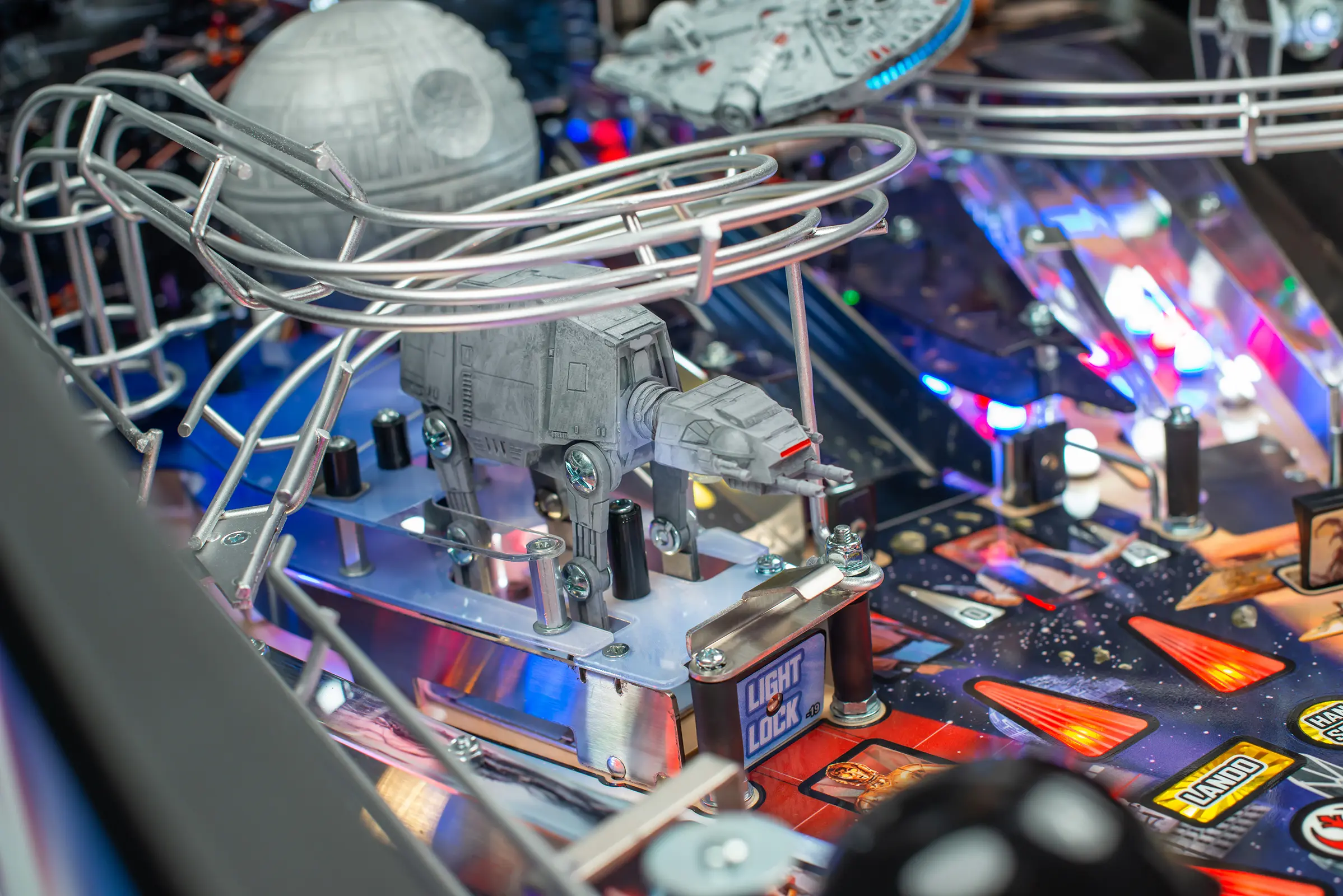 In Stern Pinball’s Star Wars: Fall of the Empire pinball games; players will take part in the adventures that started it all and experience iconic Star Wars-inspired moments through a pinball experience like no other. Players will take down the AT-AT by attaching their snowspeeder’s tow cable and shooting the spiral ramp to send it crashing down, mirroring the breathtaking scene from Star Wars: The Empire Strikes Back. Destroy the Death Star II from Star Wars: Return of the Jedi by lowering shields on the battle station during Death Star Multiball to save the galaxy. Players can also escape from Cloud City when reactivating the Millennium Falcon’s hyperdrive by hitting the center jump ramp to escape to hyperspace. Throughout the pinball experience, players will enter Jabba the Hutt’s Sarlacc Pit, battle stormtroopers, defeat TIE fighters, and even mimic using the Force to save your ball on the journey to defeating the Empire. Feel the power of the dark side as you enjoy special Darth Vader-inspired modes.