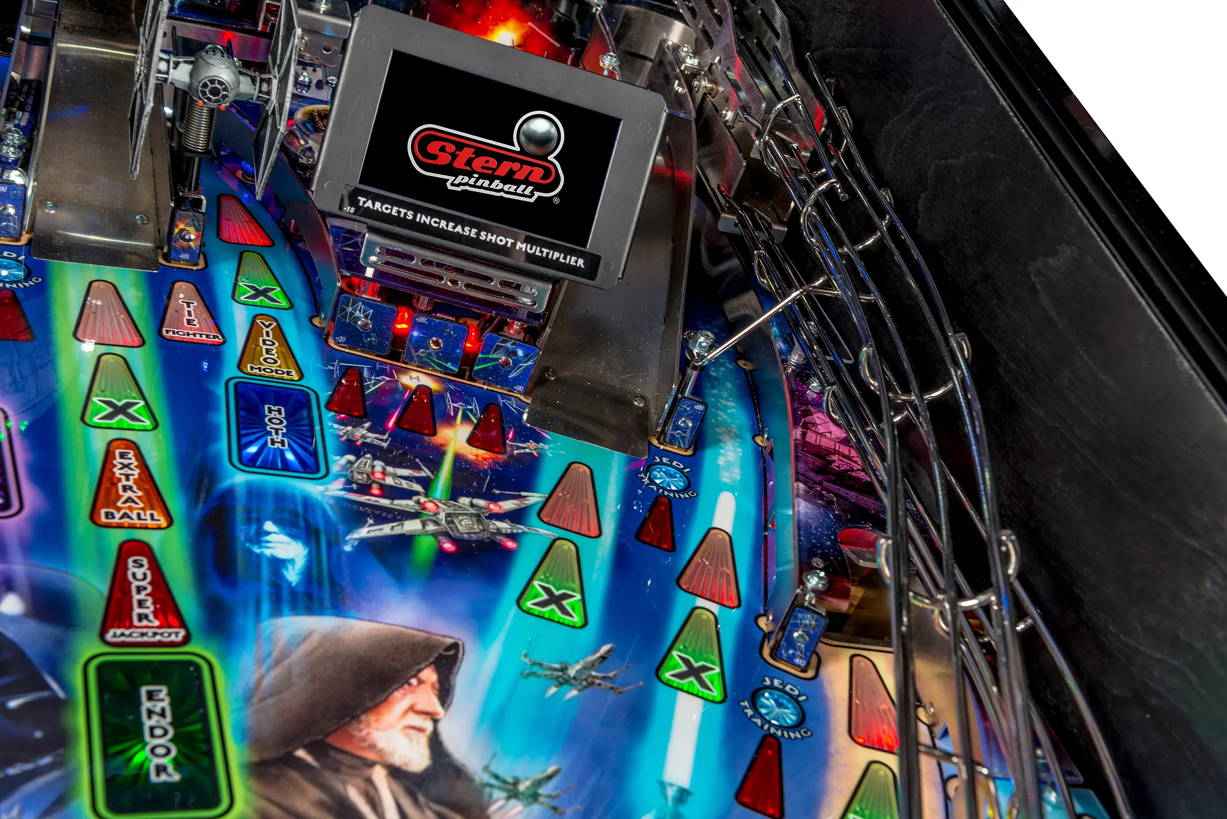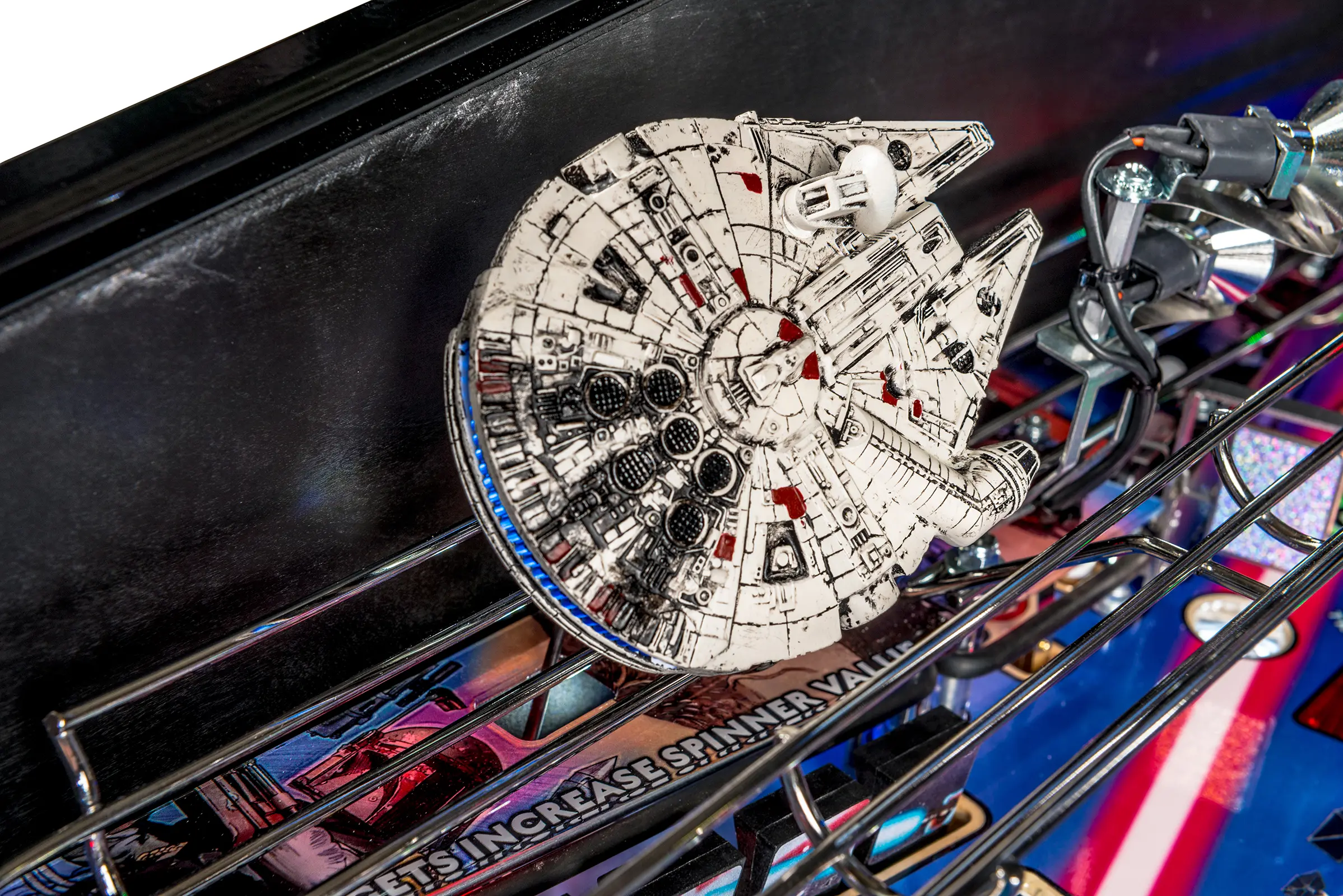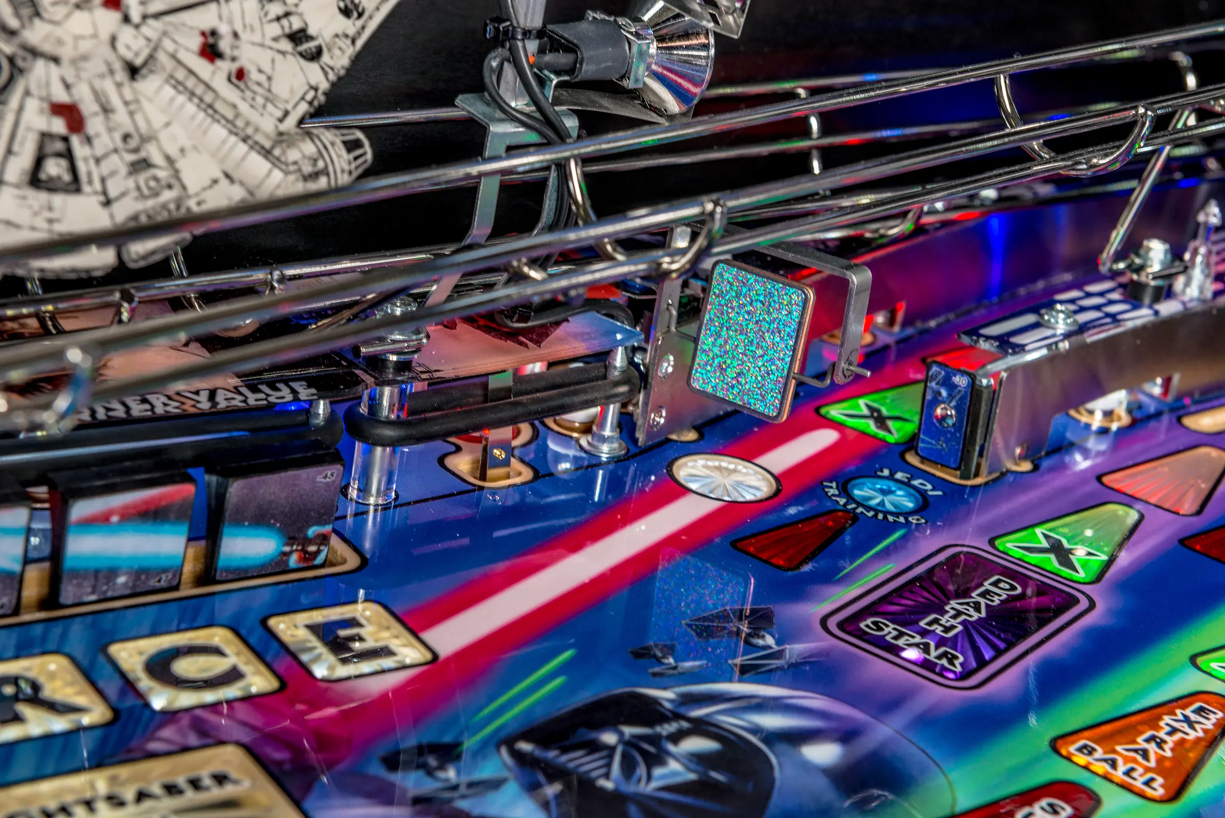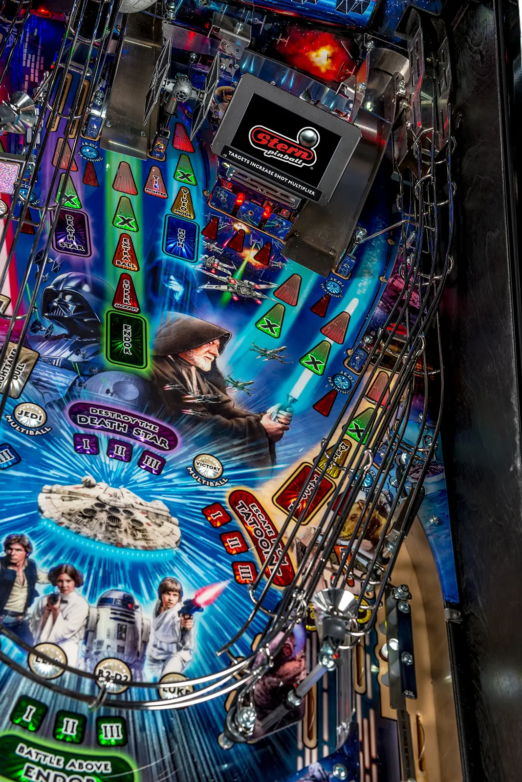 - Laser-etched "May The Force Be With You" Electric Gate in right drain lane saves the ball in play when lit!