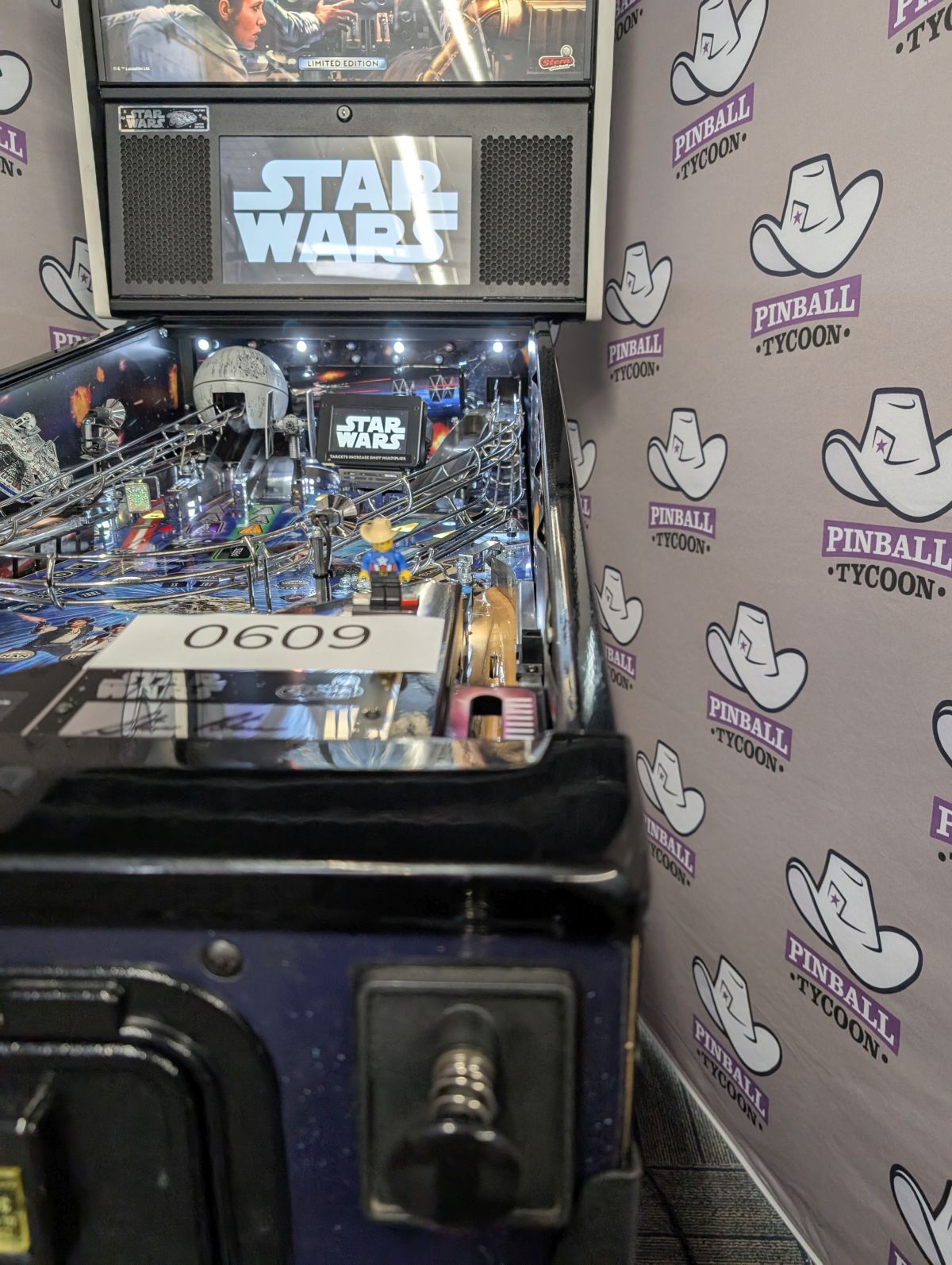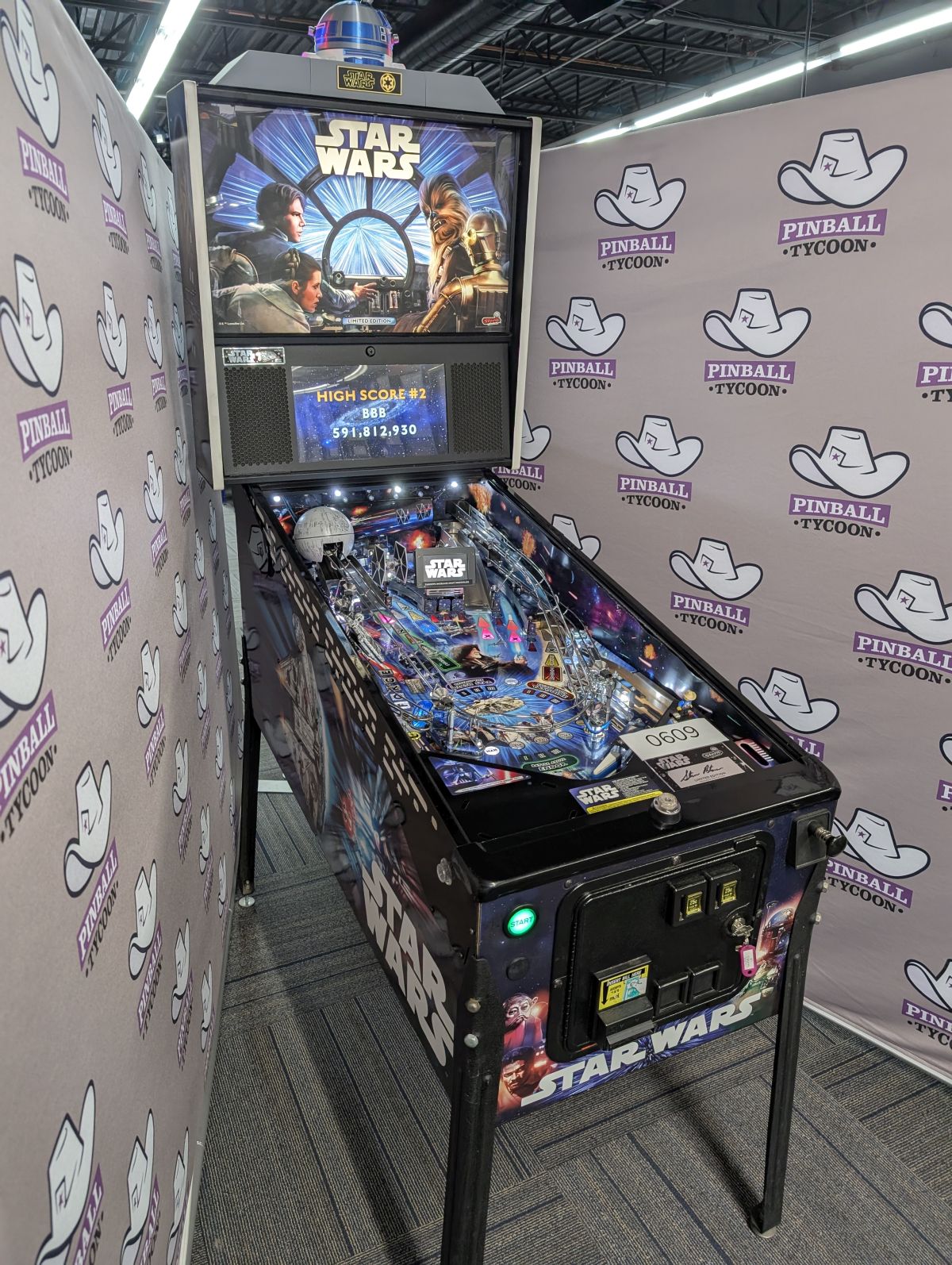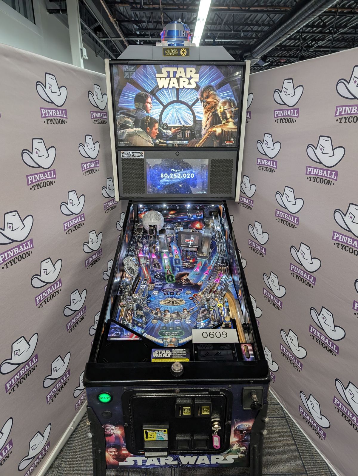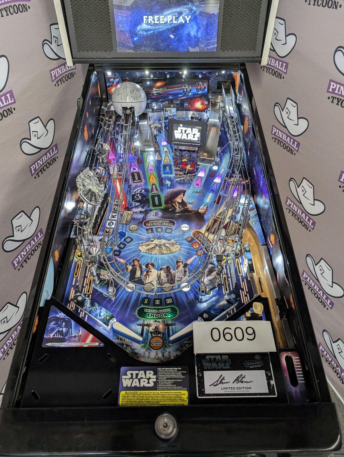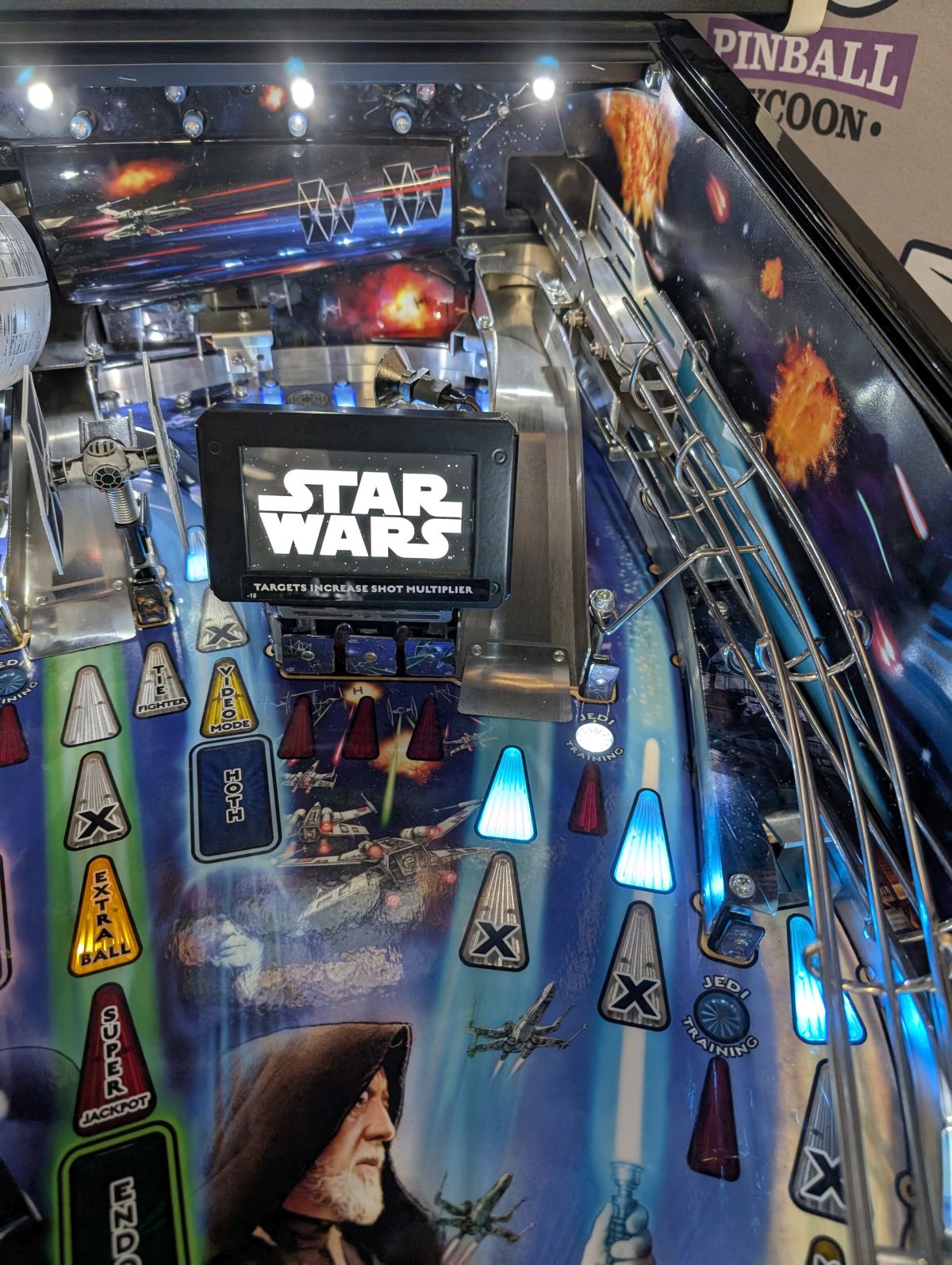 - Laser-etched "May The Force Be With You" Electric Gate in right drain lane saves the ball in play when lit!