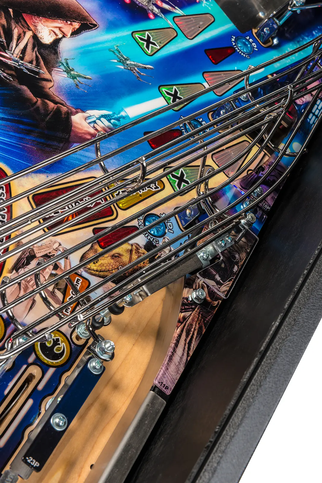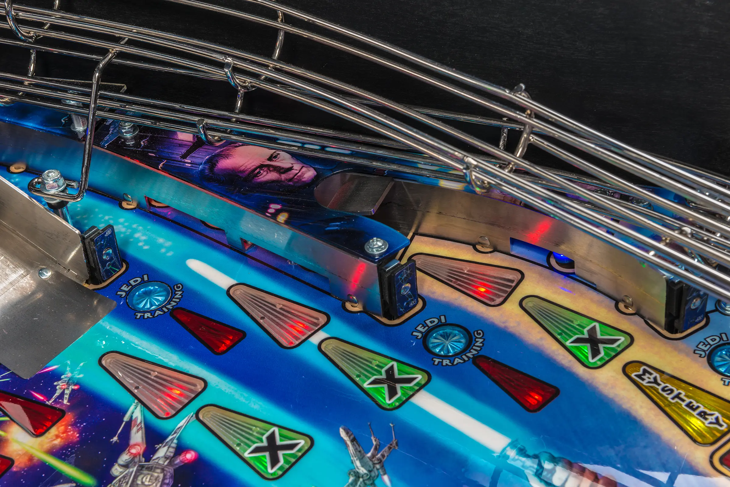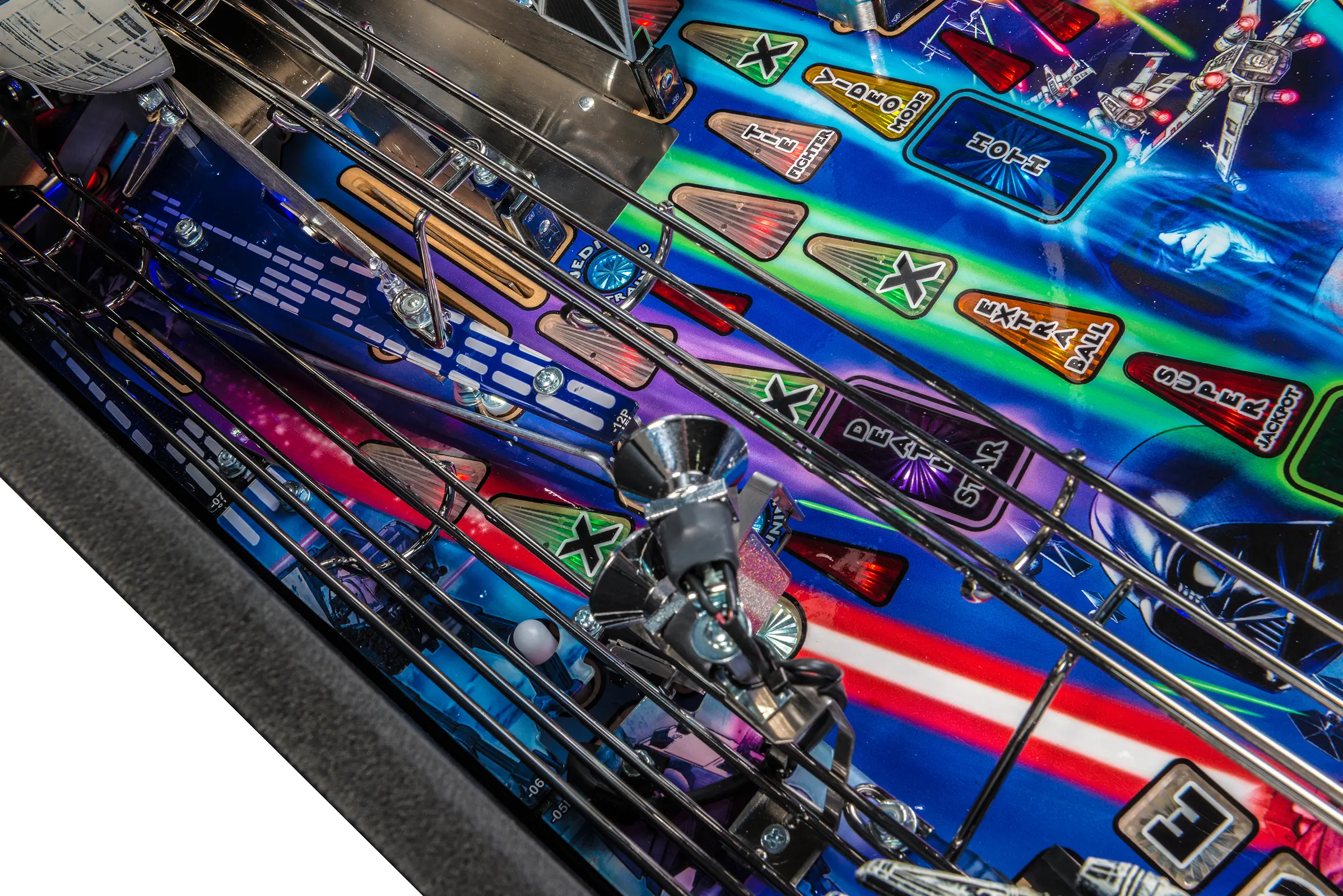 - Laser-etched "May The Force Be With You" Electric Gate in right drain lane saves the ball in play when lit!