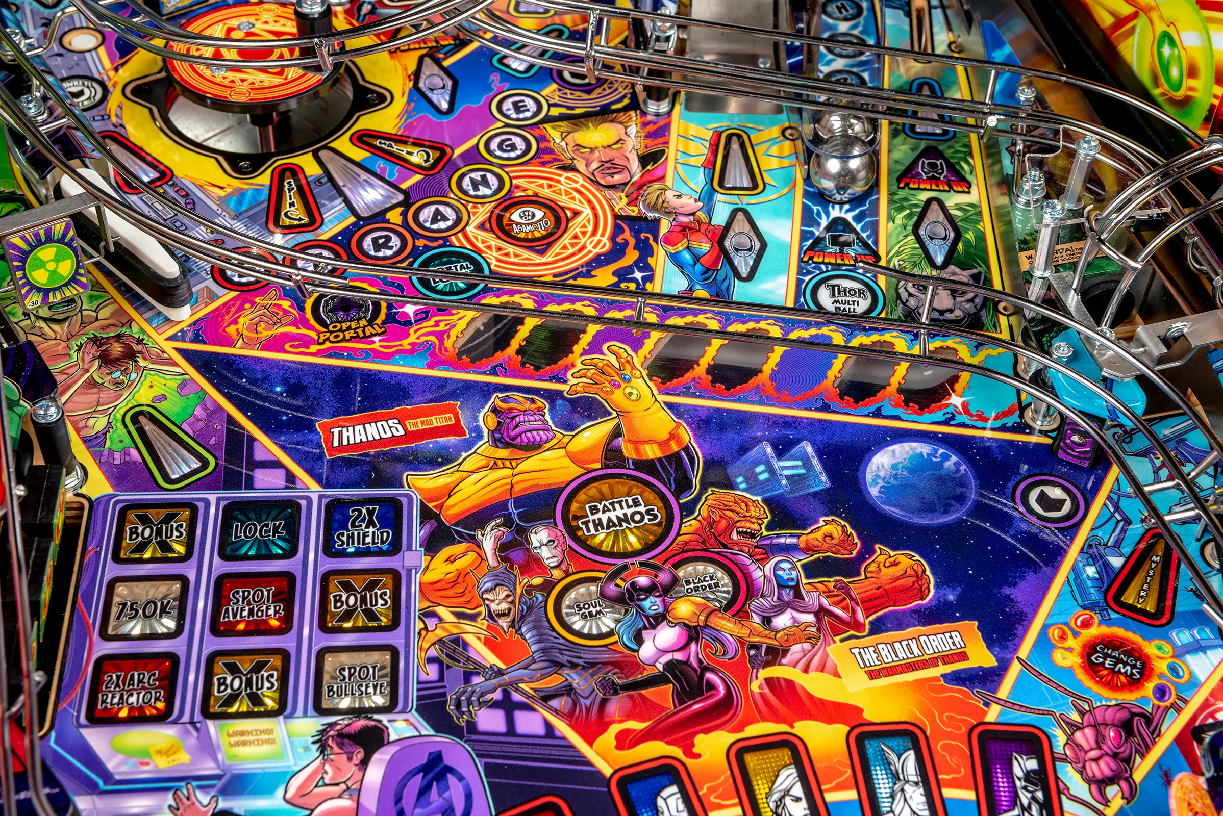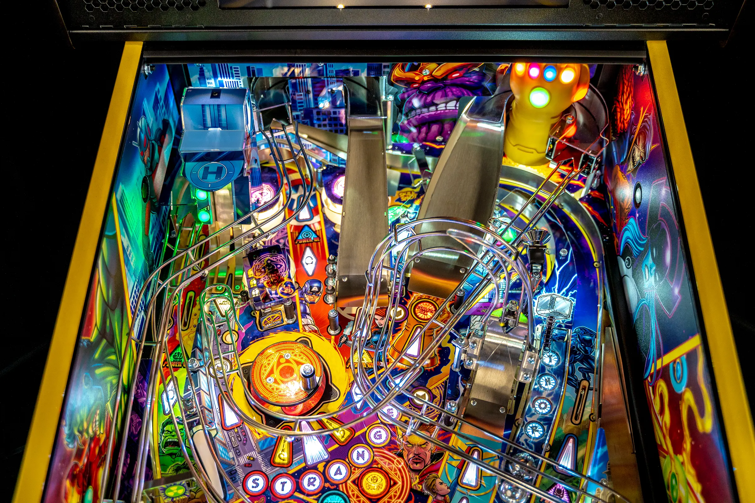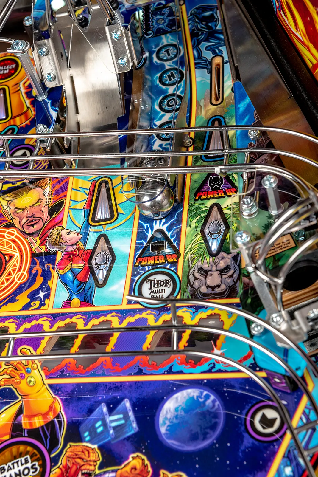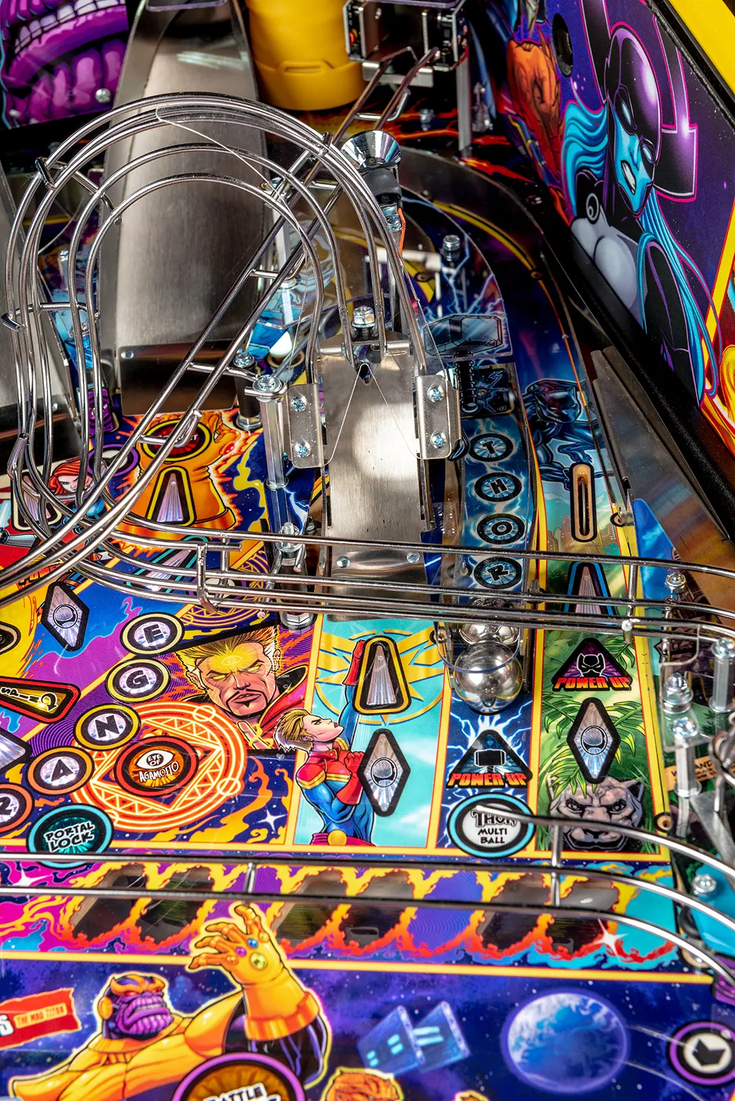 The Premium and Limited Edition models feature an interactive Dr. Strange motorized pop-up disc scoop, transporting pinballs into an underground Portal, a visible subway capable of holding and staging up to 3 balls through custom playfield windows accentuated with dynamic RGB lighting effects.  These models also include a custom sculpted Thanos Infinity Gauntlet integrated with atmospheric light-up gems, a Captain Marvel inverse gravity custom wireform ramp, and a Pym Laboratories vertical up-kicker.