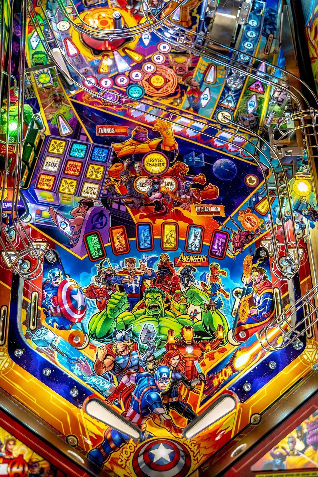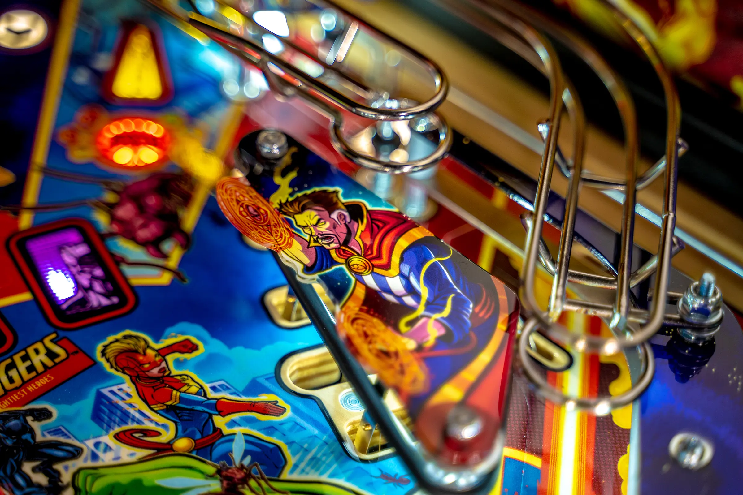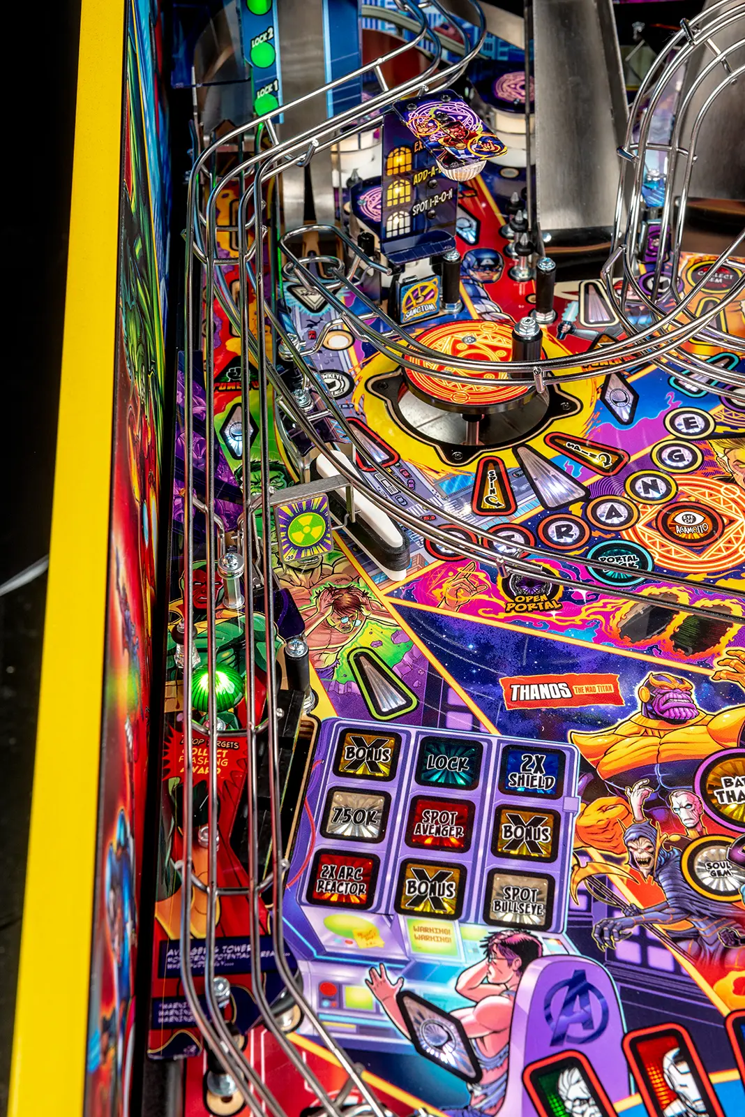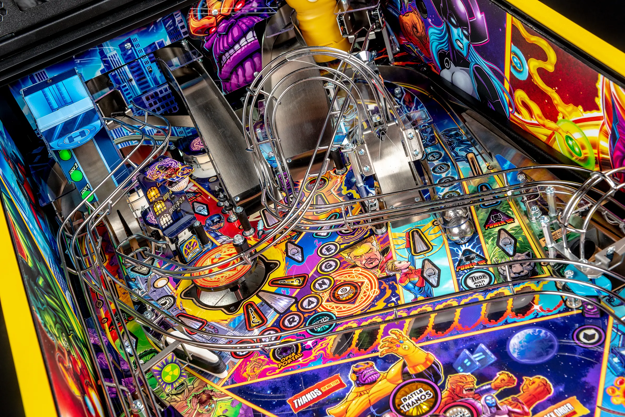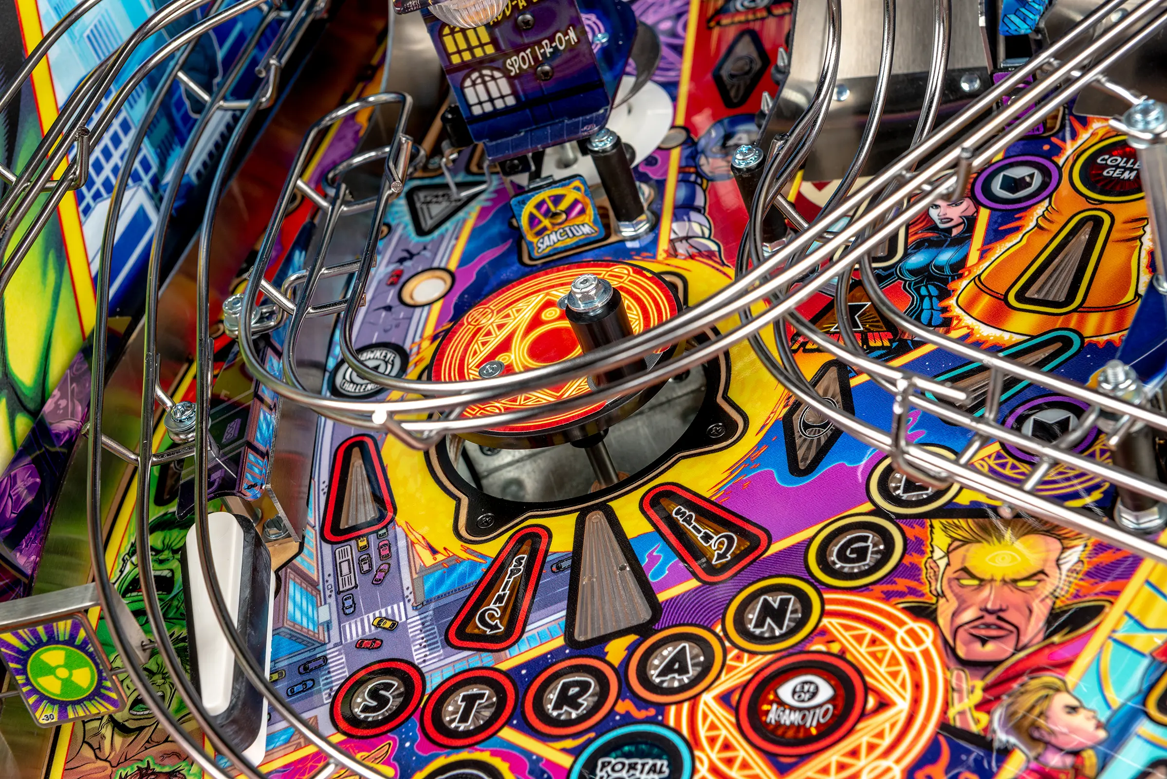 The Premium and Limited Edition models feature an interactive Dr. Strange motorized pop-up disc scoop, transporting pinballs into an underground Portal, a visible subway capable of holding and staging up to 3 balls through custom playfield windows accentuated with dynamic RGB lighting effects.  These models also include a custom sculpted Thanos Infinity Gauntlet integrated with atmospheric light-up gems, a Captain Marvel inverse gravity custom wireform ramp, and a Pym Laboratories vertical up-kicker.