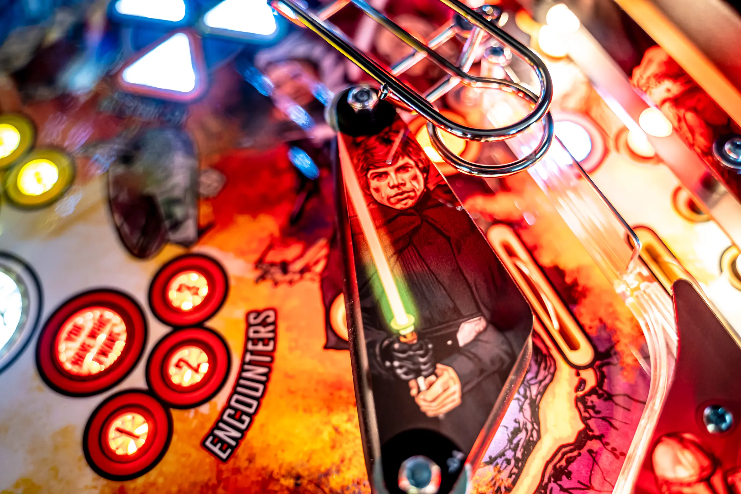 Featuring a gravity changing and rotating Encounter upper mini playfield with two flippers and 6 stand-up targets for intense battle action and Grogu's "Force" magnet capable of catching and throwing the ball down C-H-I-L-D lanes for mystery awards.