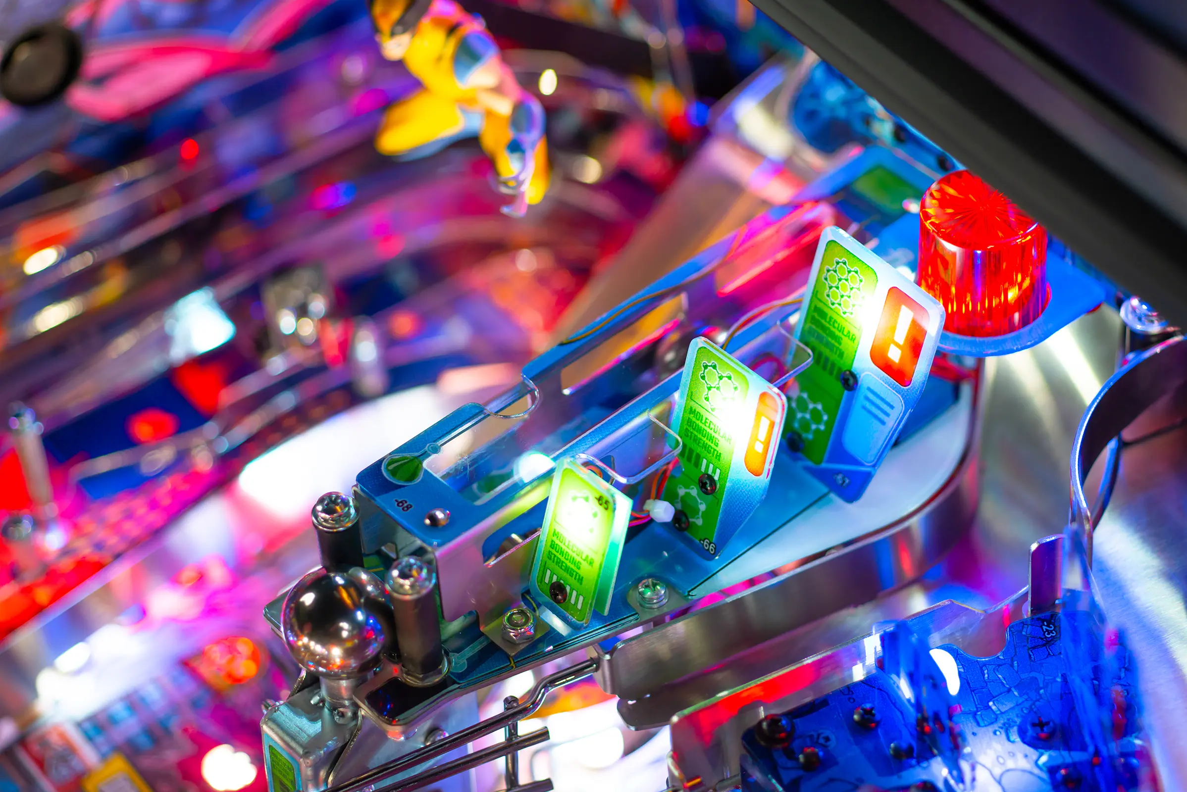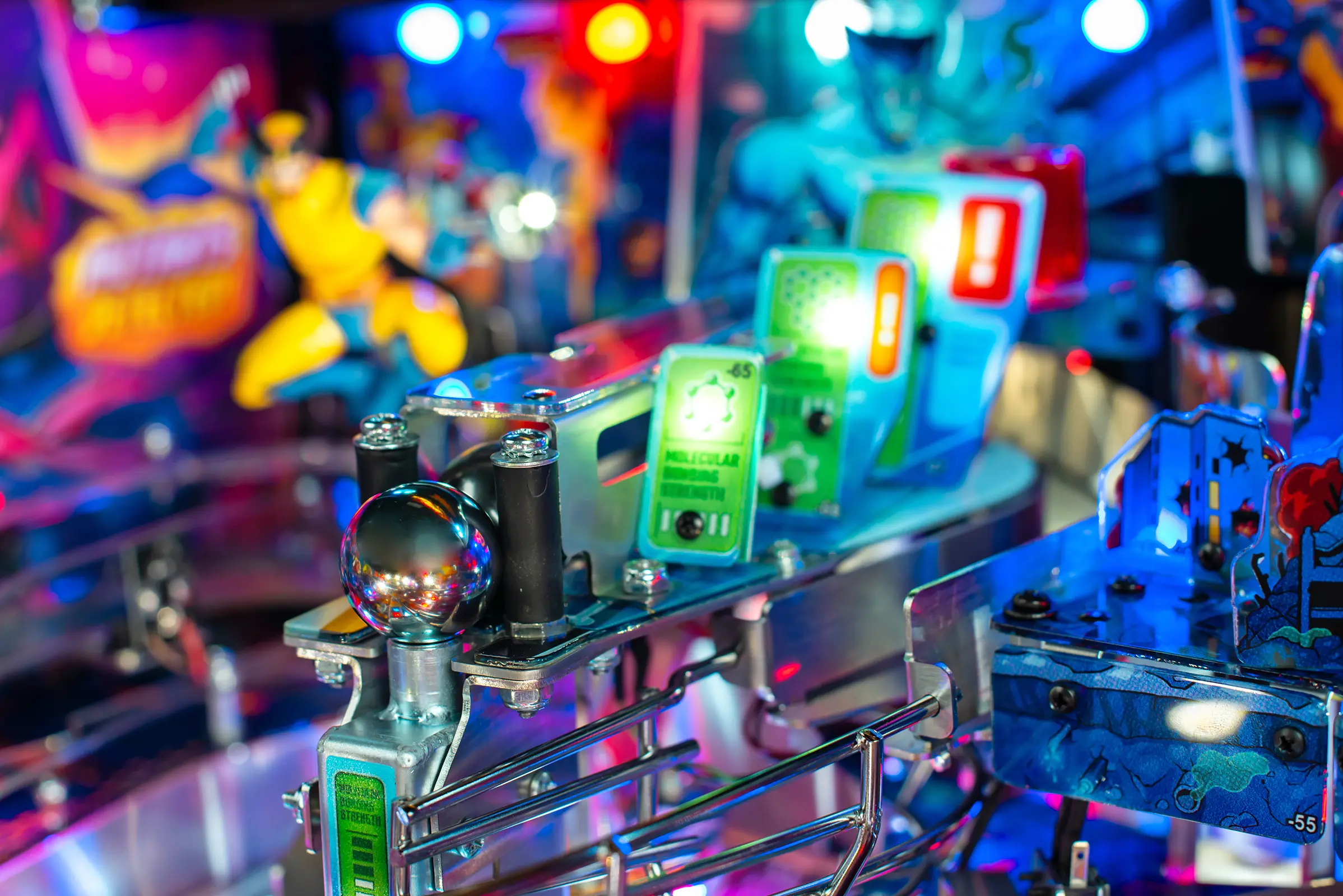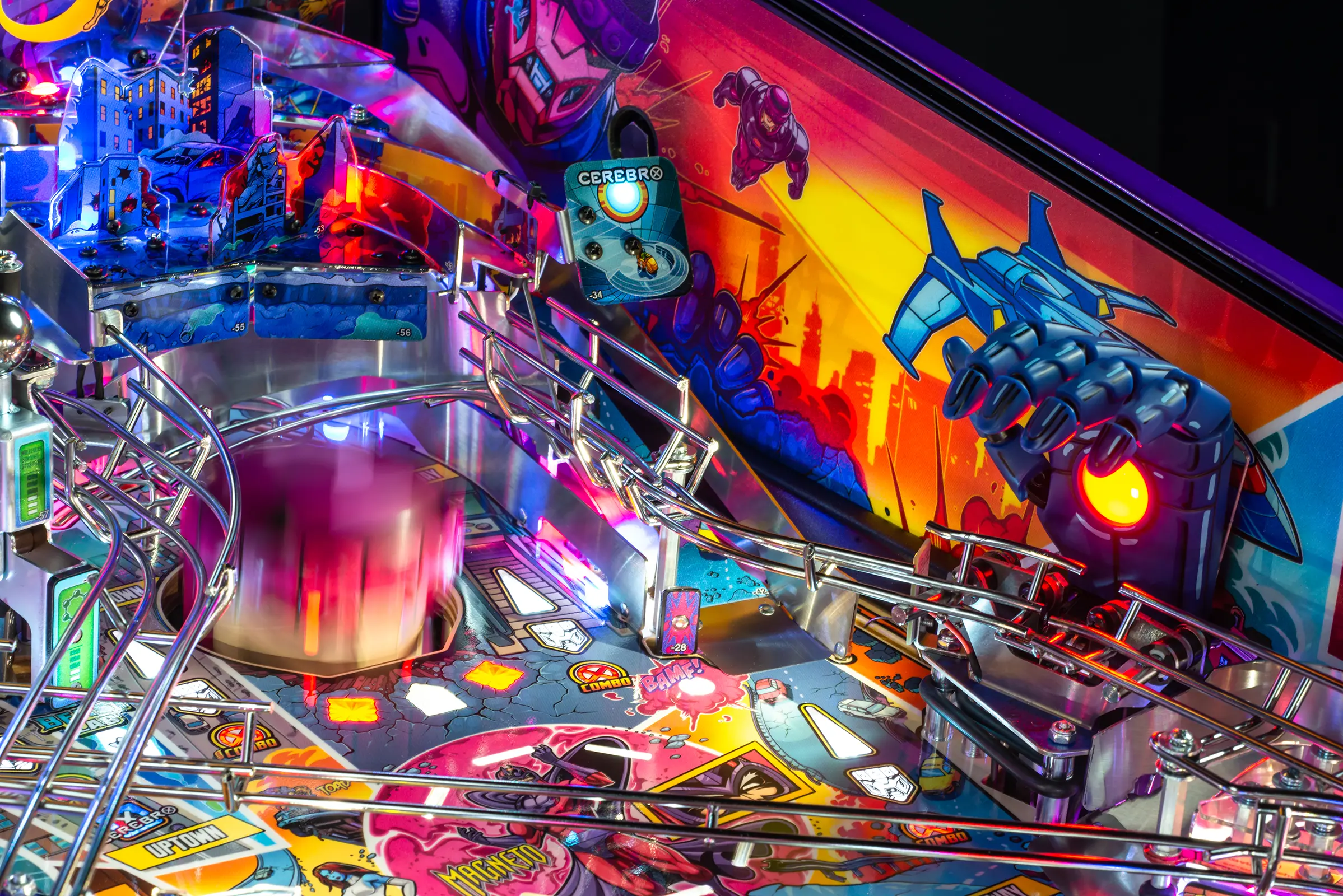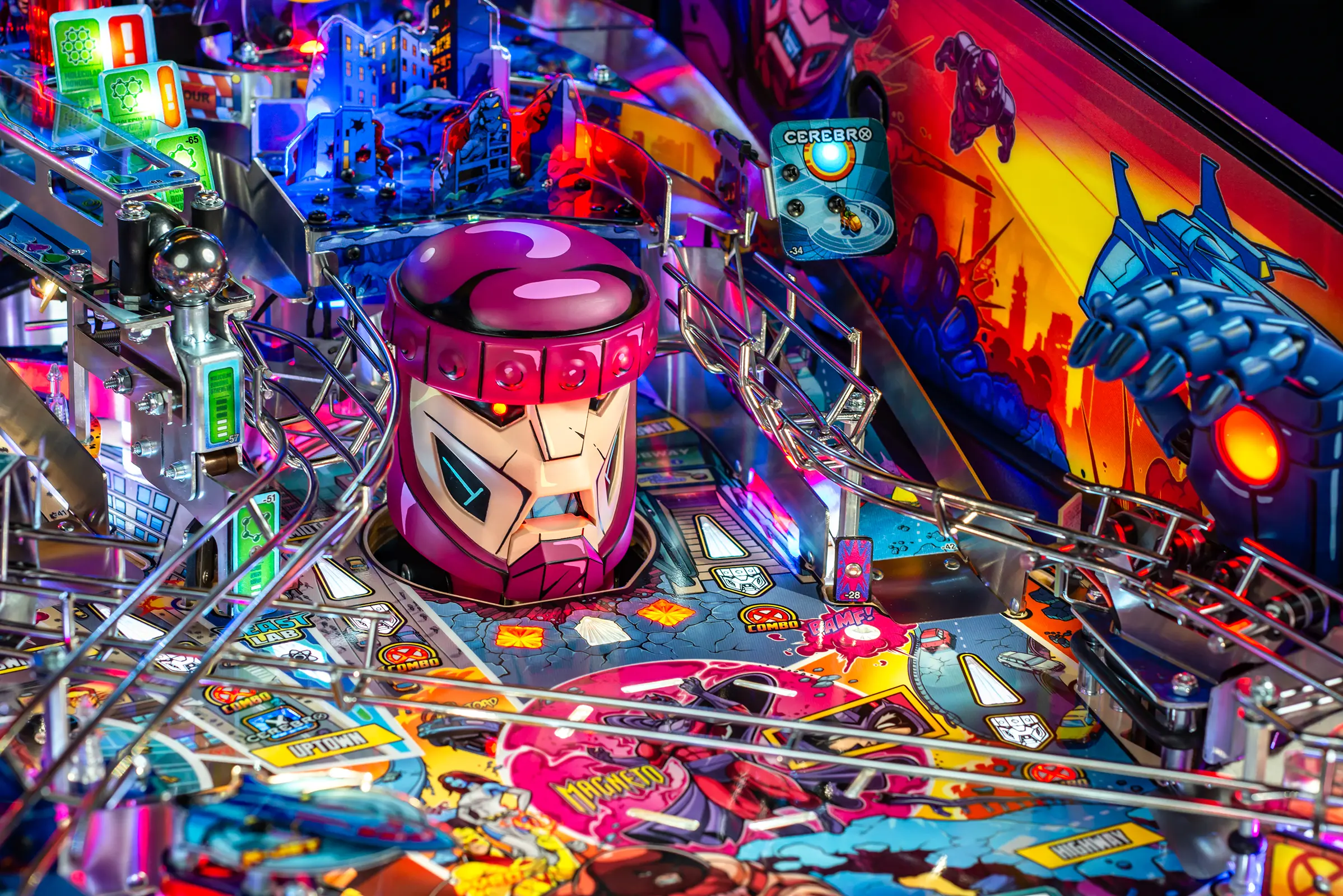 The Uncanny X-Men playfield is a unique pinball layout that features an array of new crossing shots and ramp designs with surprising ball trajectories to deliver kinetic satisfaction. The all-new Danger Room design, located to the left of the main flippers, offers a high-risk, high-reward experience that includes a mini-flipper and a novel outlane spinner. Premium and Limited Edition models also include an all-new elevated captive ball vari-target themed as Beast’s Lab.