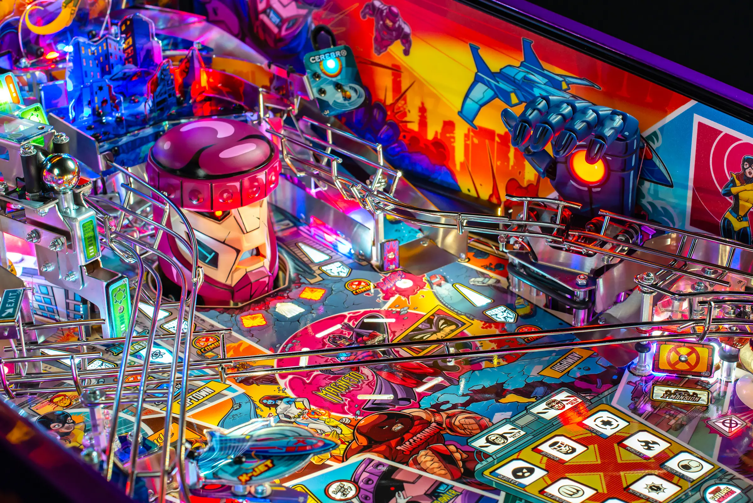 The Uncanny X-Men pinball game features a mechanically articulated Sentinel for the player to battle. The Sentinel’s large robotic head changes its state based on the player’s actions. In the Premium and Limited Edition models, the Sentinel rises from underneath the playfield and fights back by destroying the player’s ramps or attacking the ball with its extended hands.
