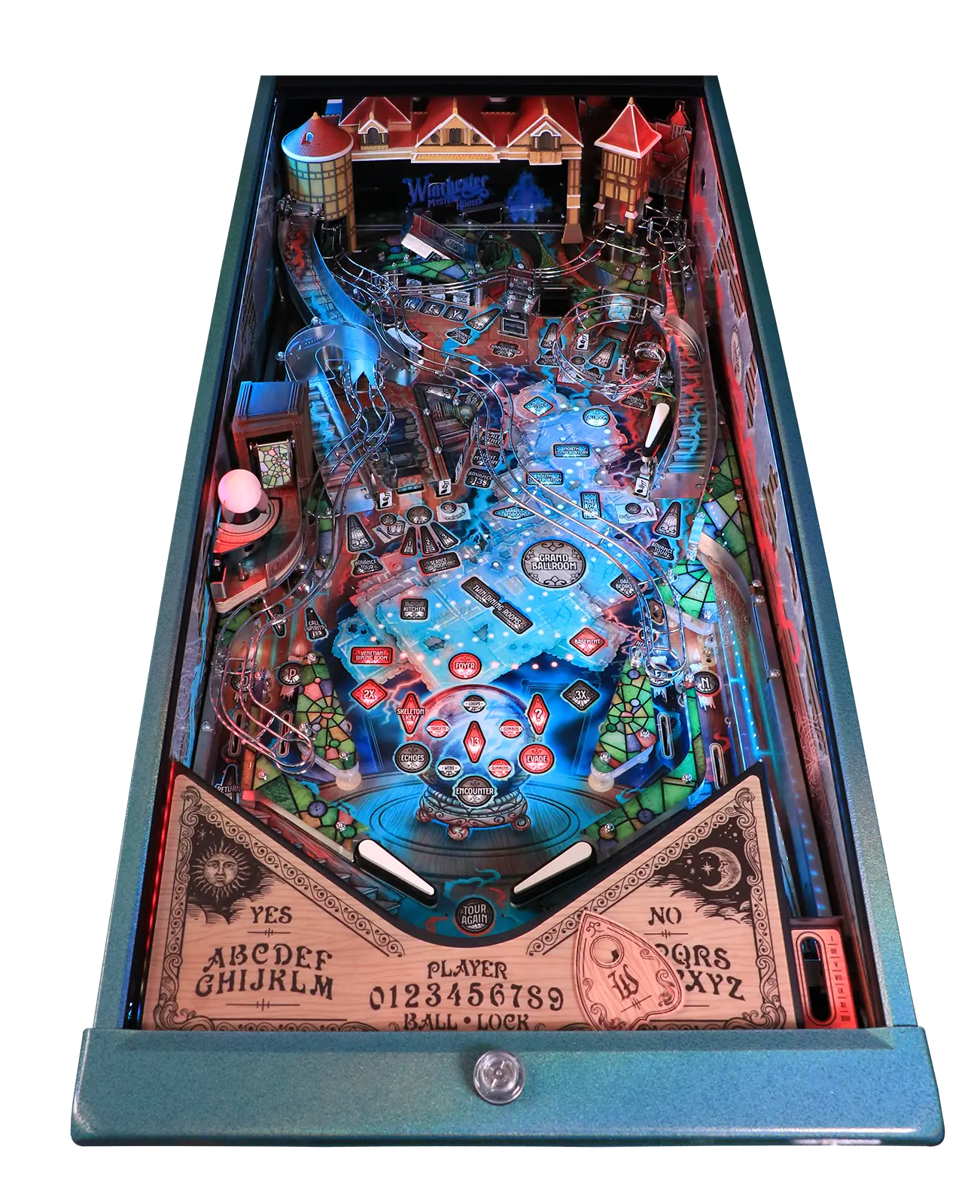 Barrels of Fun is proud to announce our latest haunting under glass – Winchester Mystery House® Pinball – based on one of the most famous haunted houses in the world! From the mind of pinball legend Karl DeAngelo, of IE Pinball, comes an eerily immersive experience like no other that takes players on a tour of the enigmatic mansion. A labyrinth of corridors awaits players as they navigate hidden passageways, staircases and doors to nowhere, earthquakes, falling towers, seance rooms, and more throughout a realm where the spirits never rest. The Winchester Mystery House® is an architectural wonder and historic landmark in San Jose, CA that was once the personal residence of Sarah Lockwood Pardee Winchester, the widow of William Wirt Winchester and heiress to a large portion of the Winchester® Repeating Arms fortune. From 1886 to 1922 construction seemingly never ceased as the original eight-room farmhouse grew into the world’s most unusual and sprawling mansion. Featuring world-class sculpts, mesmerizing shot paths, stunning original artwork by Brad Albright, and custom music composed by Jeff Dodson, do you dare step into the most immersive haunted house pinball machine to-date?